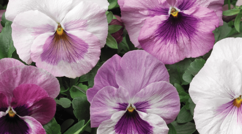 Pansy 'Sweetheart Glow' has a consistent, compact habit with large, pastel pink flowers in tones of lavender and white, and features a bright, whiskered face.