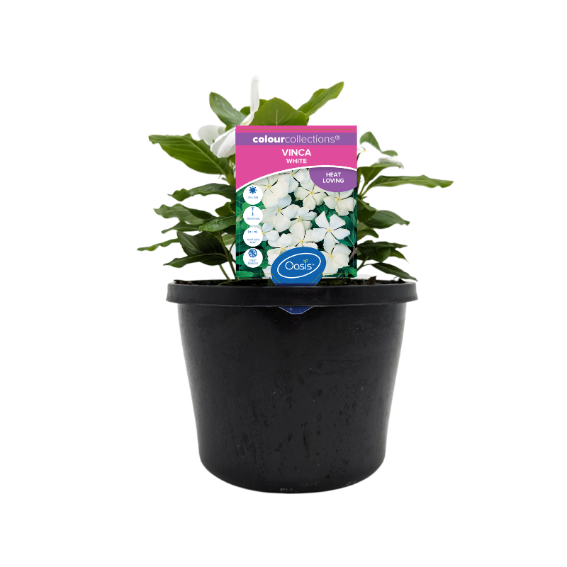 These compact, heat loving annuals are great for sunny locations. Vincas produce large, vibrant white flowers and lush, green glossy foliage. In a hanging basket or in the ground, the result is always a beautiful display of bright colour and texture.