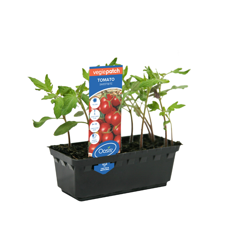 Tomato ‘Sweetbite’ is an outstanding tall growing tomato variety which bears many trusses of small, cherry-sized tomatoes with hearty flavour. The plants will need to be staked due to the number of fruits that will appear in clusters, which will turn to a rich red as they mature. Bake tomatoes whole on the trusses to intensify flavours.