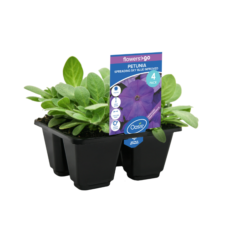 Petunia 'Spreading Sky Blue Improved' is a hardy, heat loving variety with a spreading habit, which produces masses of magenta purple flowers over many months. Individual plants will grow as wide as one metre across in garden beds or will cascade beautifully over the side of pots or hanging baskets.