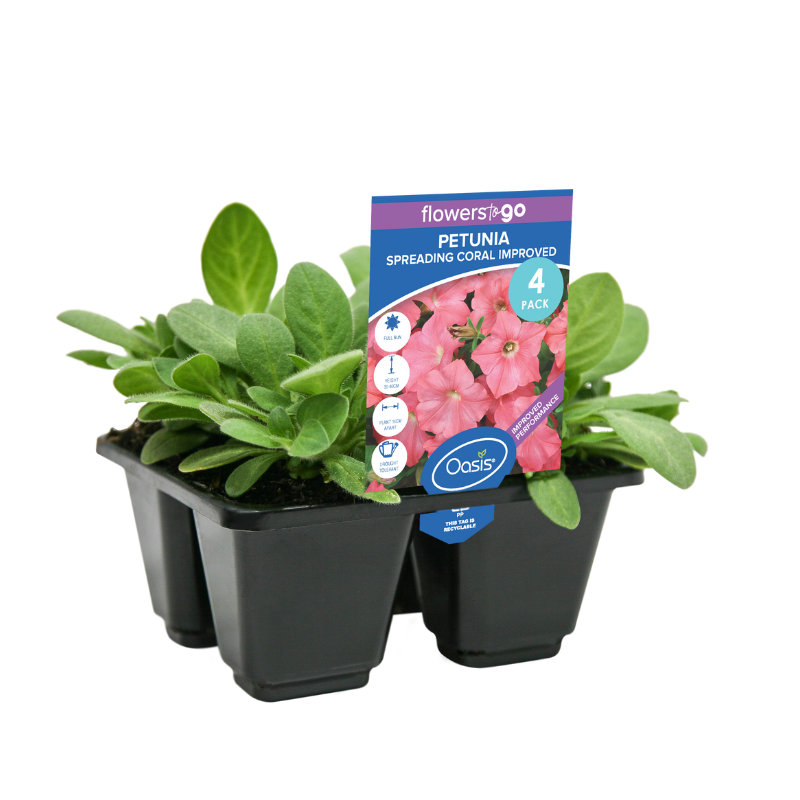 Petunia 'Spreading Coral Improved' is a hardy, heat loving variety with a spreading habit, which produces masses of coral flowers over many months. Individual plants will grow as wide as one metre across in garden beds or will cascade beautifully over the side of pots or hanging baskets.