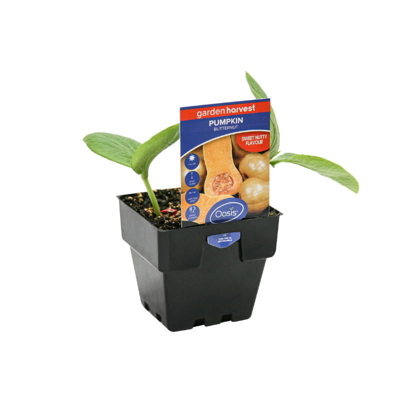 Pumpkin 'Butternut' is a thin-necked, pear-shaped fruit with deep yellow skin and orange flesh. Pumpkins grow on trailing vines which produce thick skinned, fleshy fruit. Perfect for soups and other hot dishes. Can be frozen.
