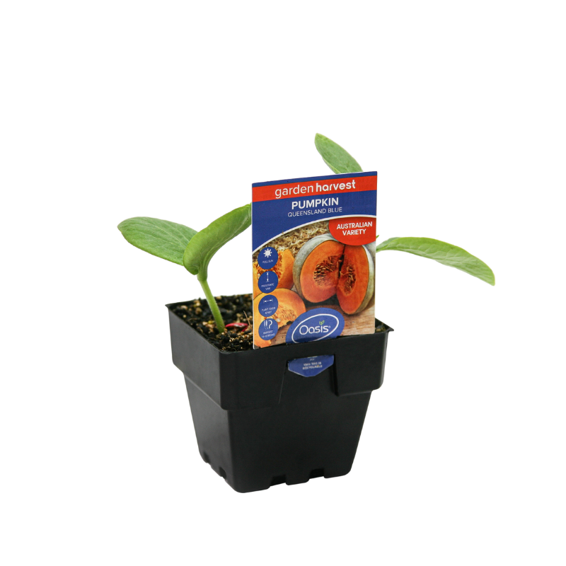 Pumpkin 'Qld Blue' is a popular, large Australian Heritage pumpkin with green skin and deep orange flesh. Grows on trailing vines and produces large, thick-skinned fruit that stores well. Plant in its own patch with plenty of space.