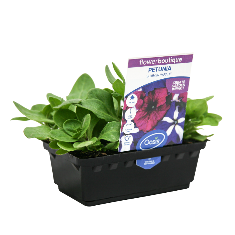 Petunia 'Summer Parade' is a funky blend of rich dark blue and burgundy petunias, some featuring dizzy star-stripes. The large flowers are held aloft on compact plants of very uniform habit. Petunias are hardy summer annuals that are easy to grow, requiring little water once established. Protect from snails.