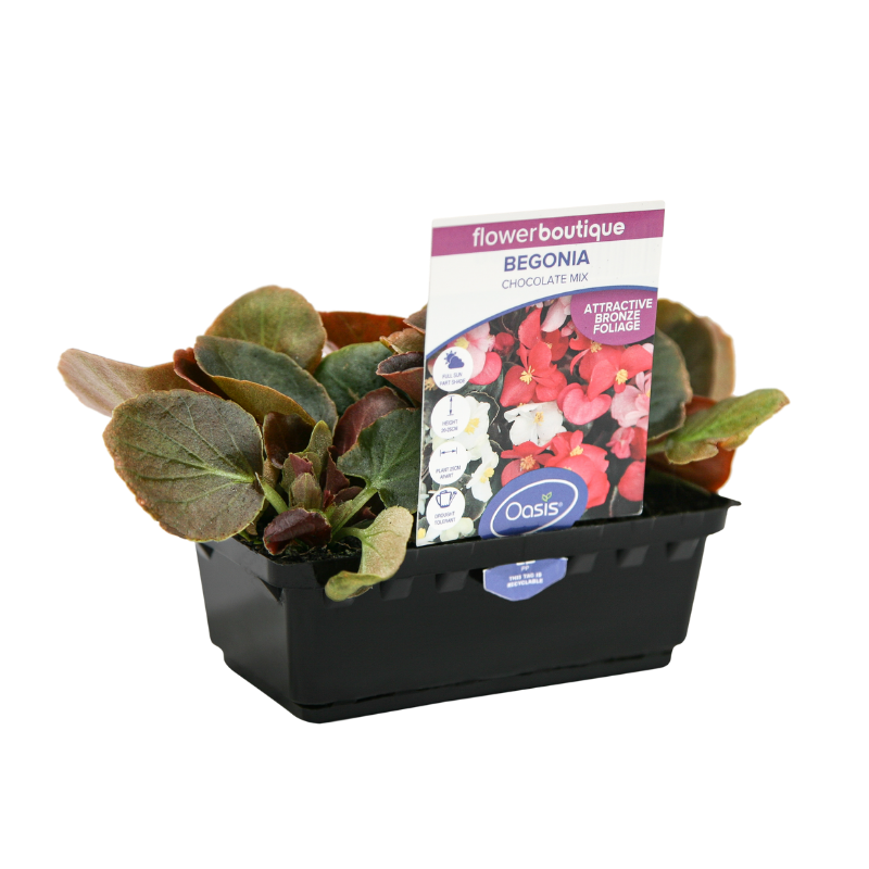 Begonia 'chocolate Mix' produces masses of flowers in shades of pink, rose, scarlet and white on low growing plants with attractive bronze foliage. Begonias are adaptable, free-flowering bedding plants. Bedding begonias flower soon after planting, developing into neat, compact plants that tolerate periods of dryness once established.