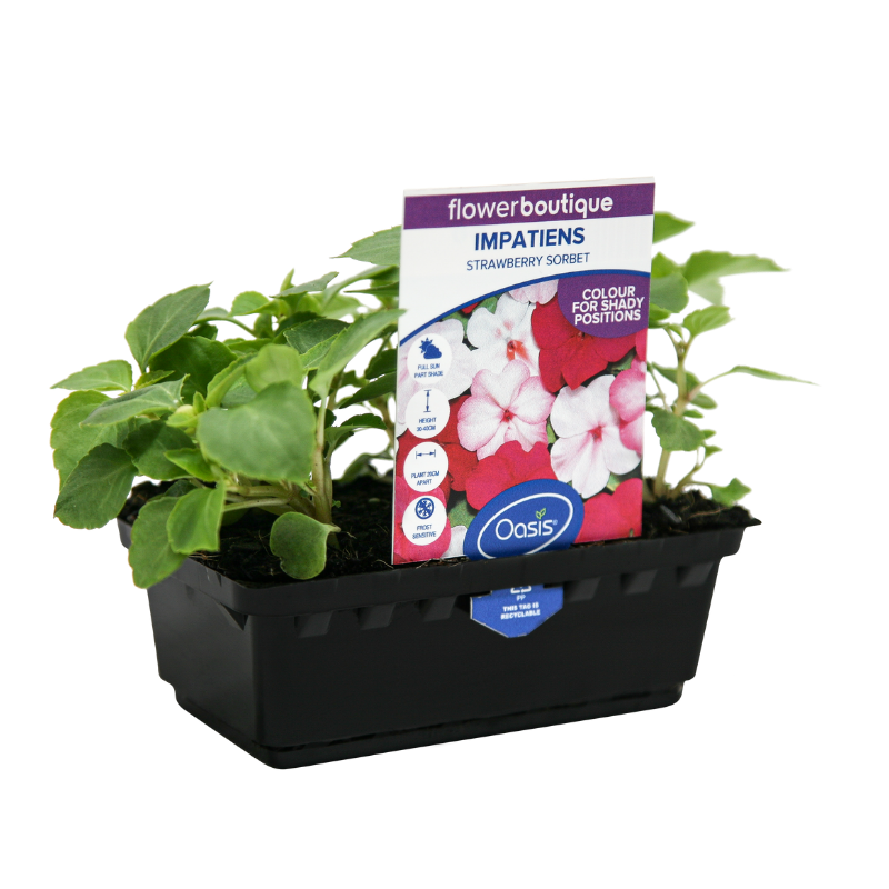 Impatiens 'Strawberry Sorbet' is a special selection of pink shades on neat compact plants. Impatiens are semi-shade lovers which produce masses of colourful, long-lasting flowers. They prefer warm, sheltered conditions and tolerate morning sun.