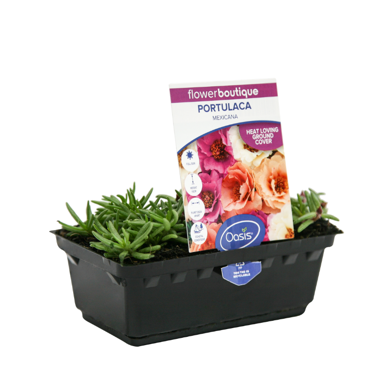 Portulaca 'Mexicana' produces a profusion of double flowers in contrasting shades of musk pink, vanilla, mango and lemon. Portulaca are low, spreading annuals that love the heat, with flowers that open in the sunshine and close at night.