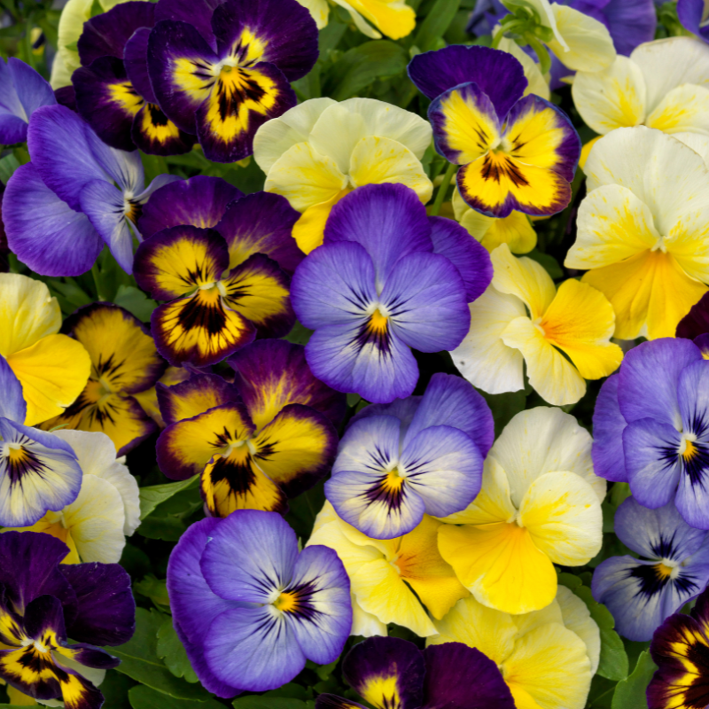 Viola 'Butterfly Storm' is a unique mix of dark-faced yellow and purple, creamy yellow to white and fading blue blooms over hardy, compact green foliage. Great for pots and garden beds.