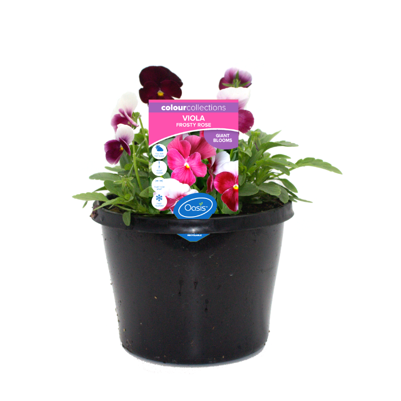 Viola 'Frosty Rose' is a giant flowering viola which produces masses of pale to dark pink ombre blooms early in the season and well into early Spring. This viola has a higher heat tolerance than other standard violas and fills pots easily.