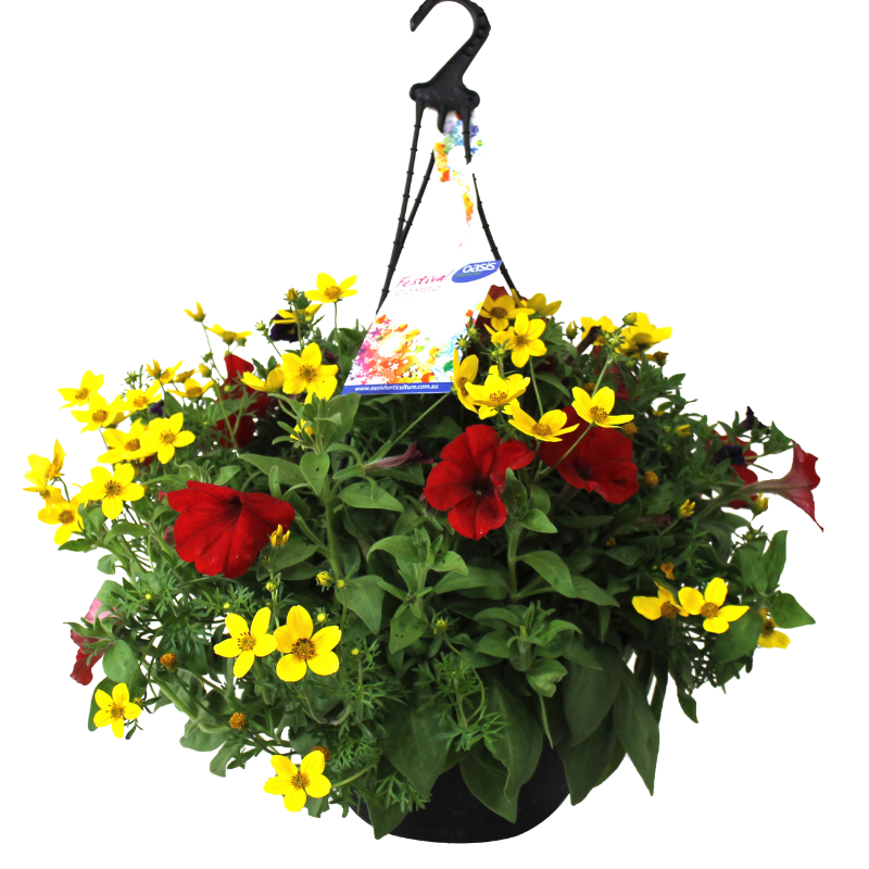 Festival 'Firecracker' is a vibrant collection of seasonal flowering perennial and annual plants making up a beautiful hanging basket. Full of colour and variety to brighten up your patio, balcony, pergola or other outdoor living spaces.