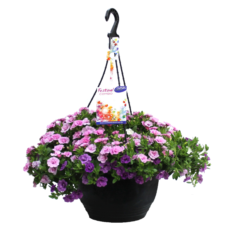 Festival 'Marshmallow Puff' is a vibrant collection of seasonal flowering perennial and annual plants making up a beautiful hanging basket. Full of colour and variety to brighten up your patio, balcony, pergola or other outdoor living spaces.